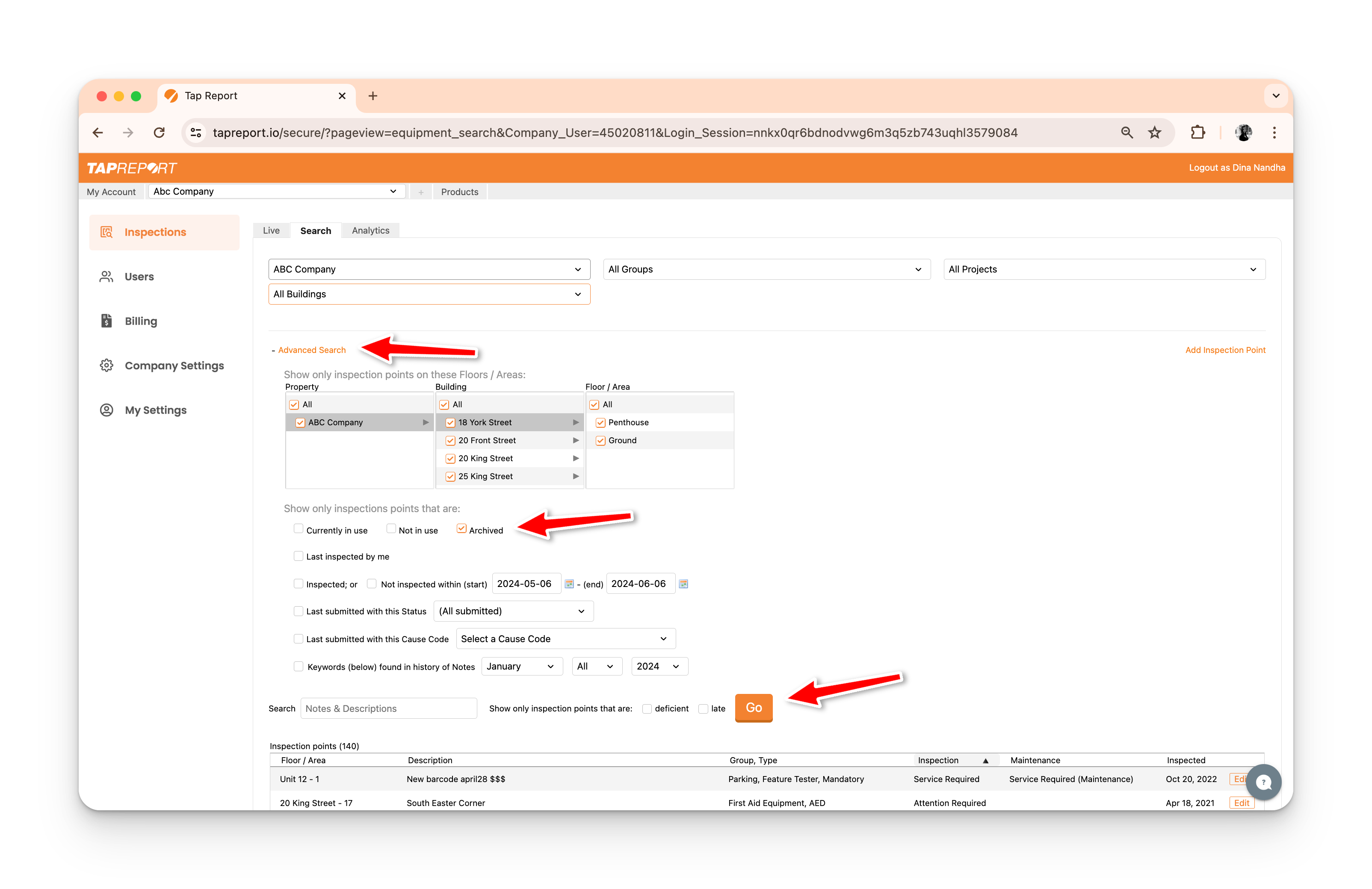 - Click on Inspections from the Main Menu