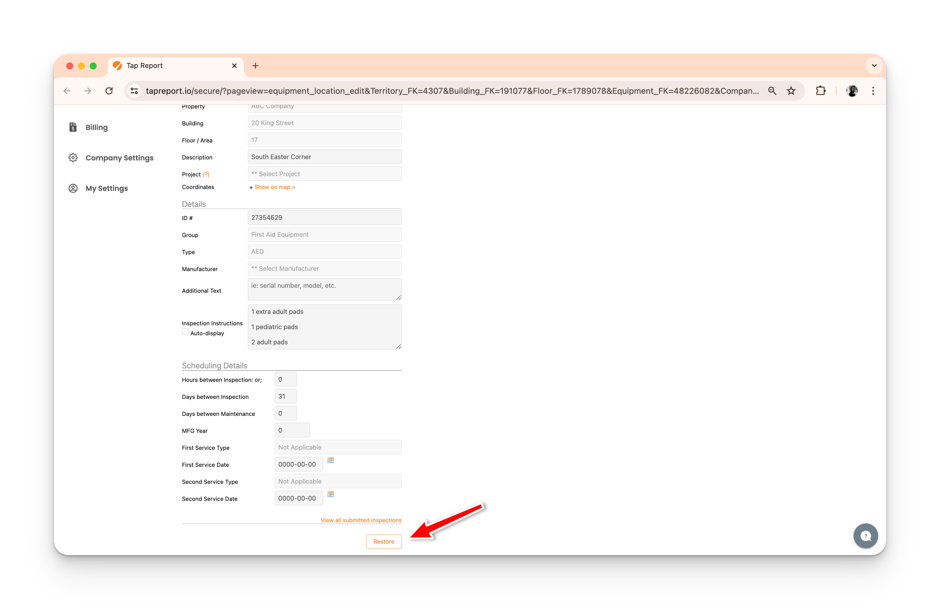 5. Press Edit for the inspection point you wish to restore